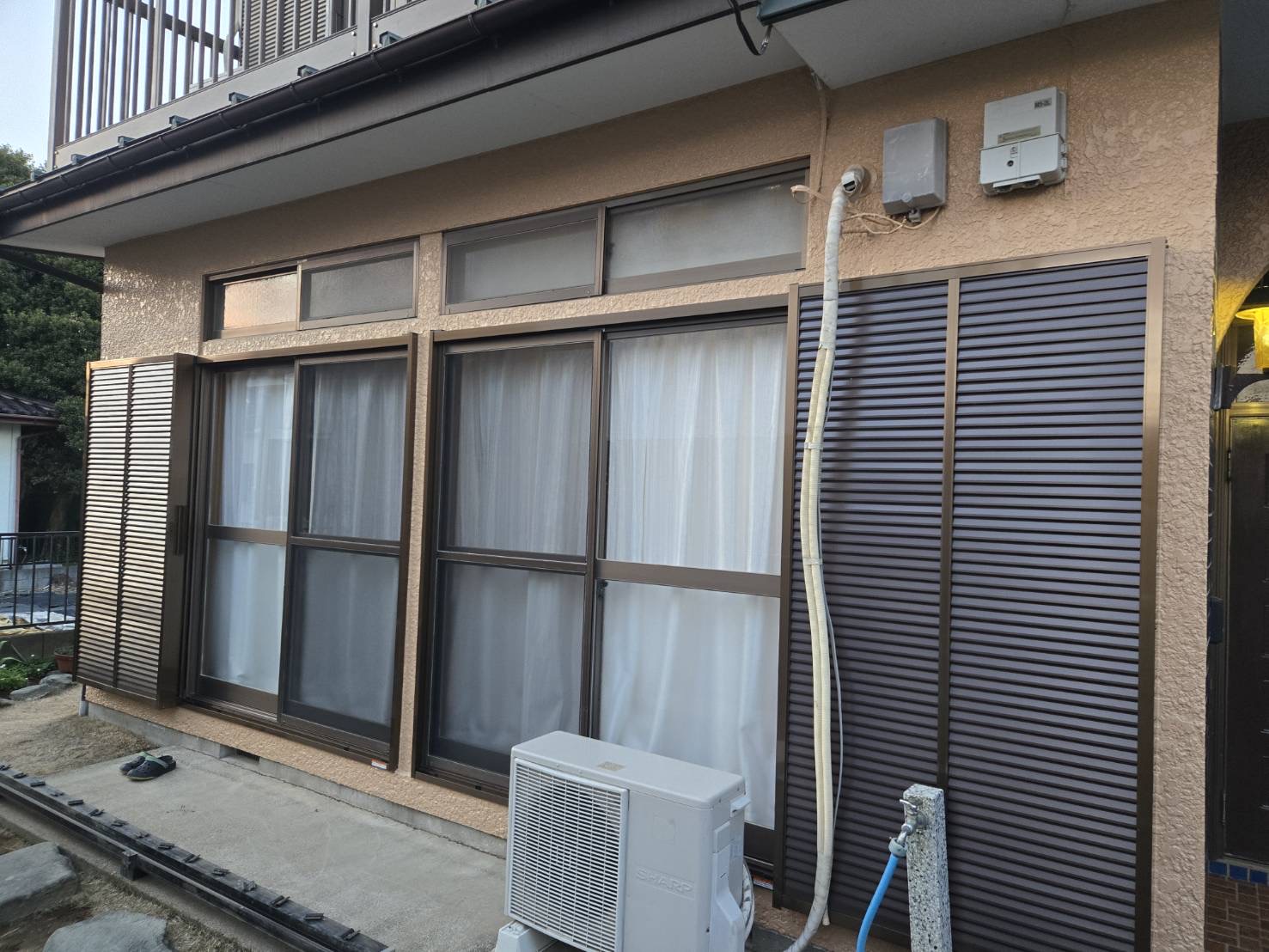 リビングの雨戸サッシ交換。ランマの流用を希望のため上手く残しつつサッシを交換しました。外壁塗装もかなり近い色に調色して違和感なく完成です。