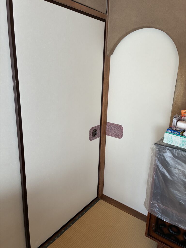 既存の襖紙同様、和紙での張替えをご希望のお客様。ダイニングキッチンとの間仕切り襖の引手が珍しい形状でした。本体に引手が彫り込まれておりそれに合わせて襖紙を施工。建具職人さんのこだわりを感じさせる引手でした。比較的シンプルなデザインが多い和紙の襖紙ですが、引手廻りの汚れ防止がアクセントとなりとても締まって見えます。