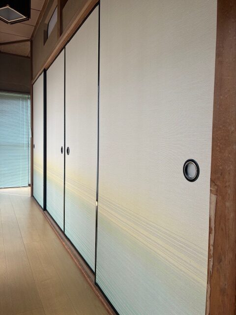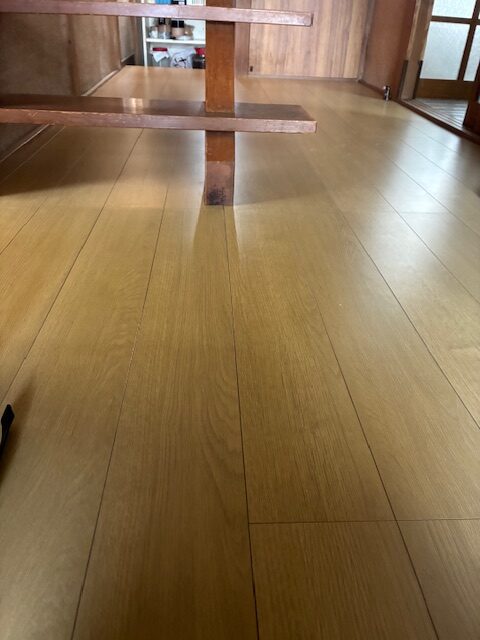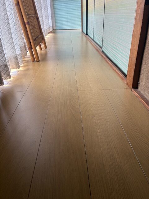 玄関から廊下、和室前の縁側にかけてフローリングの上貼り工事を実施。数か所で床材の劣化によりフカフカになっており今回のご依頼となりました。同時にL字の縁側に沿って設置されている間仕切り障子を襖に変更。窓の外や部屋中からの雰囲気が大きく変わり「想像以上に良くなった」と、とても喜んでいただけました。築20~30年を超えてくるとフローリング材の劣化が目立ってくるお宅が多いようです。良く出入りする部屋の近辺を一度チェックすることをお勧めします。