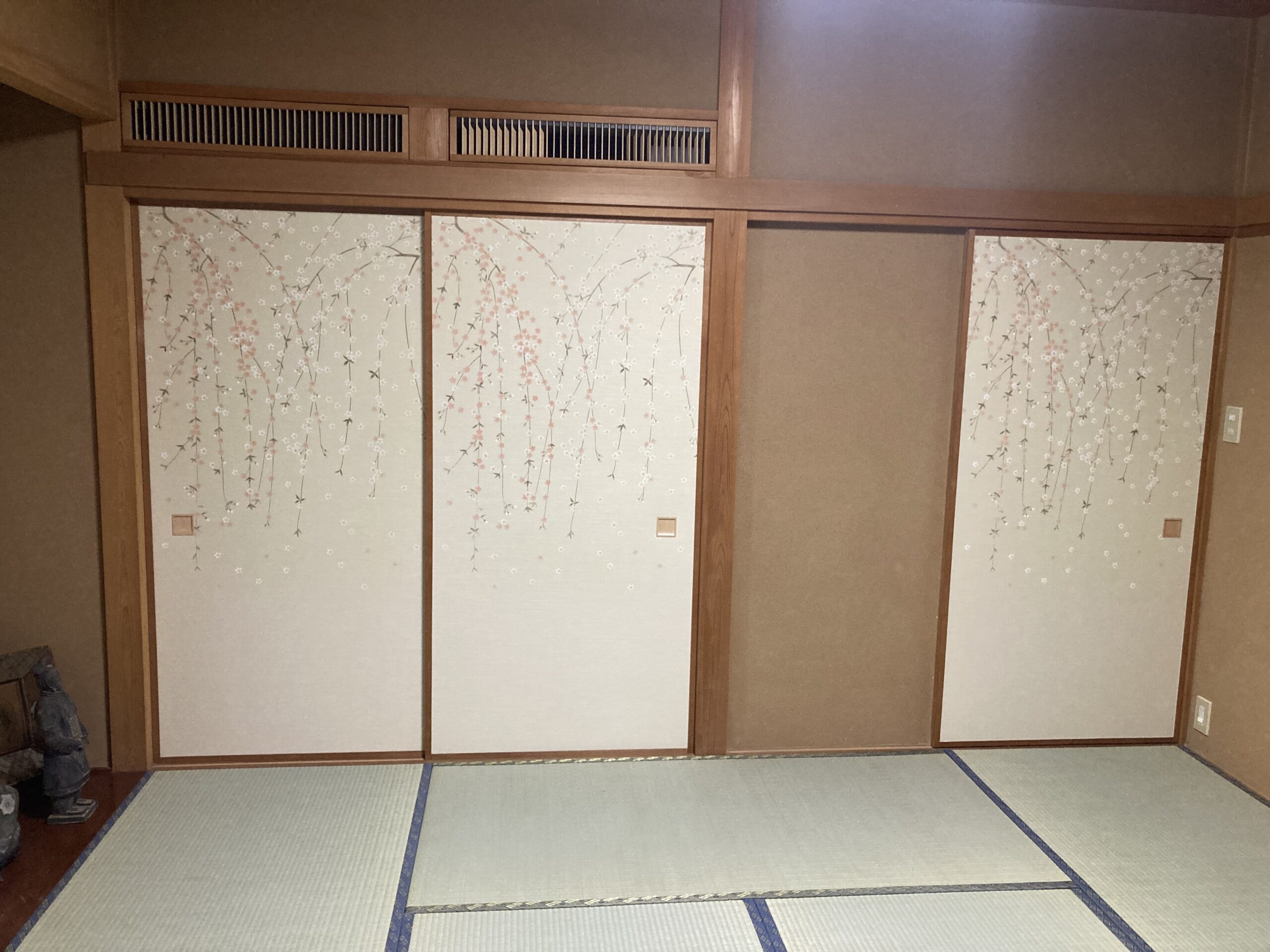 珍しい絵柄「枝垂れ桜」。 下段1/4程の絵柄や無地が多い襖紙の柄ですが、上段に比重を置いた柄は少々珍しのです。施工する襖のサイズや部屋の雰囲気も枝垂れ桜が与える印象を大きく左右します。 今回のお客様、絵柄がとても綺麗に映 […]
